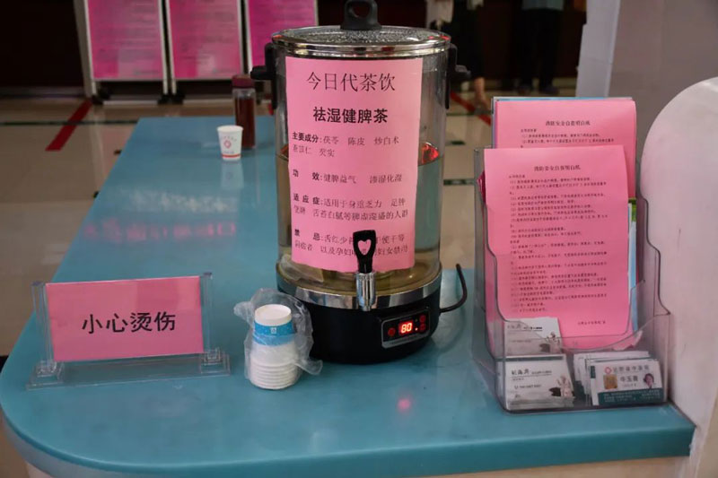 为充分发挥中医药特色优势,着力推广中医“治未病”的辨证论治思想和方法,医院特在门诊楼一楼导医台和医技楼一楼导医台设置代茶饮免费供应点。此举措不仅有意缓解患者就医时的紧张情绪,更为中医药文化的传承和普及开辟了新的途径,让群众感受医院人文关怀的同时,还能近距离接触中医药文化。